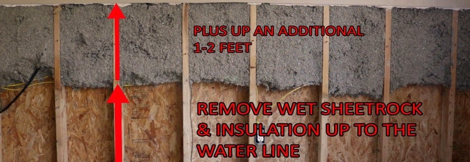 Before starting, the first thing will need to do is remove all the sheet rock and insulation that was exposed to moisture. This will be up to where the waterline is, which is typically seen. Then remove the sheet rock about two feet above the water line. This is to account for the water soaking and spreading up the wall and to help the remaining insulation stay dry.